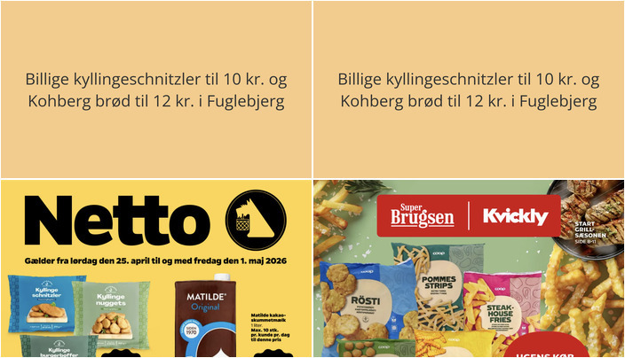 Vi har gennemgået denne uges tilbudsaviser for dagligvarebutikker i Fuglebjerg og fundet nogle fantastiske tilbud. Her er et udpluk af de bedste tilbud fra Netto og SuperBrugsen.