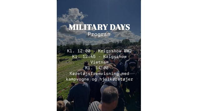 Vi glæder os til at se alle jer glade besøgende til en fantastisk og oplevelsesrig weekend. Military days afholdes i de naturskønne rammer omkring Panzermuseum East. Weekenden byder på et væld af historiske oplevelser for hele familien. Military Days er placeret blandt grantræerne i vores 17 ha. store plantage hvor du bevæger dig ind i de historiske tidslommer. Mange militære reenactmentsgrupper fra flere forskellige lande kommer med telte, hjulkøretøjer, kampvogne og masser af andet grej. Fælles for dem alle er, at de brænder for at formidle netop deres interesser og opfattelse af historien. I løbet af weekenden vil der være forskellige opvisninger som køretøjsfremvisning og det store WW2 krigsshow med skydende kampvogne og kæmpende soldater. Som noget nyt i år vil vi også afprøve et spændende Vietnam krigsshow. Der vil være salgsboder med forskelligt militaria, bespisning, ølvogn samt kaffe og kage m.m. Når du har betalt entré til museet, er der fri adgang til Military Days.