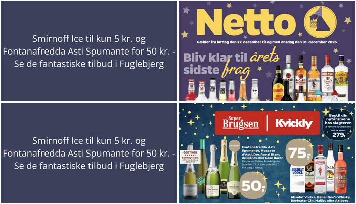SuperBrugsen har et godt tilbud på Fontanafredda Asti Spumante, Moscato d'Asti, Duc Royal Blanc de Blancs eller Gran Baron til en pris af 50 kr. pr. flaske. Tilbuddet gælder fra lørdag den 27. december til onsdag den 31. december.